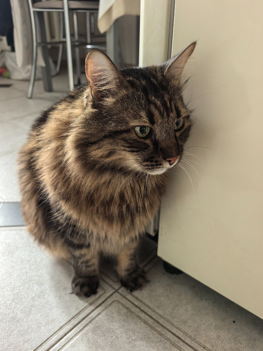 А ещё у нас поднялся очень сильный ветер. Ещё когда хозяйка ходила в магазин, рассказывала, что местами её чуть не сдуло. А ночью ветер ещё сильнее стал. Всё шумело, грохотало везде. Хозяйка испугалась, что может сетку с окна сорвать (хотя она вроде и неплохо закреплена, но всё может быть) и я вместе с этой сеткой улечу. Встала, сказала уйти мне с окна и закрыла его. Ну а мне без открытого окна на балконе сидеть неинтересно. И будет ветер ещё дуть и дуть, обещали, что самый ужас настанет 17-18 числа, то есть ещё всё впереди.