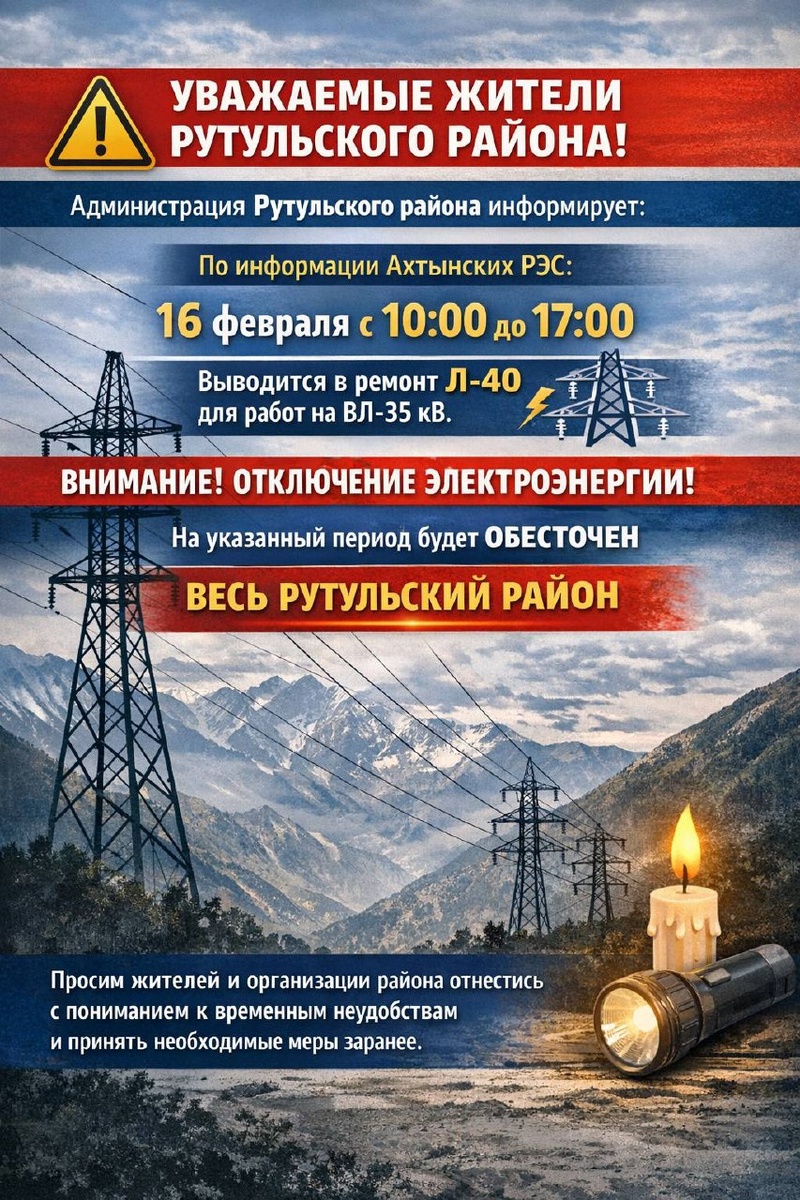 ! Администрация Рутульского района сообщает, что по информации Ахтынских РЭС 16 февраля с 10:00 до 17:00 будет выведена в ремонт линия Л-40 для проведения плановых ремонтных работ на ВЛ-35 кВ. ❗ В связи с этим на указанный период будет временно прекращено электроснабжение на территории Рутульского района. Просим жителей и организации района с пониманием отнестись к временным неудобствам и заблаговременно принять необходимые меры.