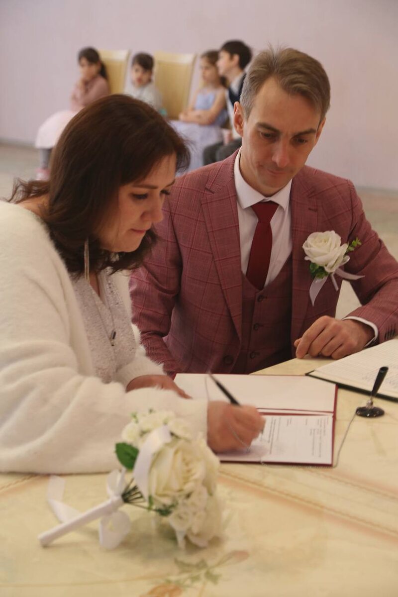 Самых младшеньких деток на церемонию мы не взяли: тяжело и бестолково. А вот старшие мои все приехали. И, кстати, все-все без исключения сильно-пресильно за мать свою непутевую были счастливы. Поздравляли от души, подарки дарили. После ЗАГСа мы всей толпой в отель отправились, где и отметили сие событие 16 февраля 2024 года...