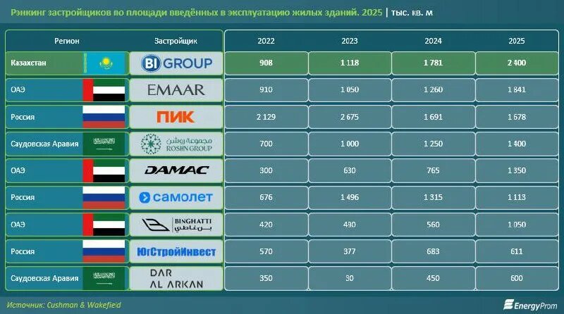 По итогам 2025 года самая большая площадь введённых в эксплуатацию жилых зданий у BI Group — 2,4 млн кв. м. Также в ТОПе: Застройщик известен такими проектами, как Burj Khalifa, Dubai Mall и Downtown Dubai, и работает преимущественно в премиальном и люксовом сегментах Специализируется на брендированных проектах (Versace, Cavalli), виллах, небоскрёбах и курортной недвижимости. Ведущий государственный застройщик в Саудовской Аравии, принадлежащий Государственному инвестиционному фонду (PIF). Топовая частная компания в ОАЭ, которая известна своими коллаборациями с брендами Bugatti, Mercedes-Benz и Jacob&Co. Крупнейший по рыночной стоимости публичный застройщик Саудовской Аравии, базирующийся в Эр-Рияде.