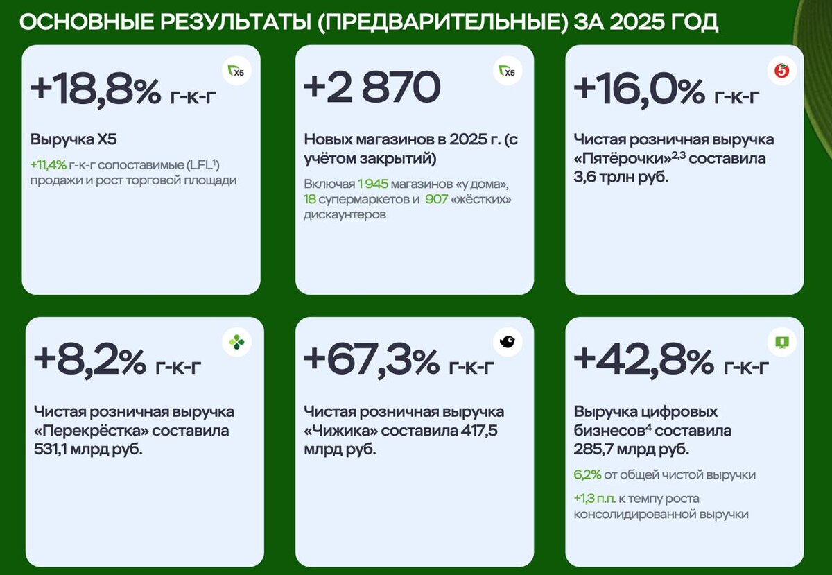 По данным Росстата, продовольственная инфляция за 2025 год составила всего 5,24%. А вот ЦБ информирует нас о росте инфляционных ожиданий населения в декабре-январе до 13,7%. Такая динамика может оказать поддержку фудритейлерам, способным «перекладывать инфляцию на полку», наращивая при этом выручку еще и за счет открытия новых магазинов. 🛒 Однако органически расти удается не всем. Лента драйвит свои доходы с помощью активной экспансии и безудержного поглощения более мелких продуктовых сетей. Магнит является «гадким утенком» сектора, значительно сократив общение с инвесторами. А что с X5? После щедрого на дивиденды 2025 года, будет интересно итоговый операционный отчет компании глянуть. Итак, чистая розничная выручка Группы за отчетный период выросла на 18,4% до 4,6 трлн рублей. При этом Чижик продолжает расти ударными темпами в 67,3%, уверенно подрастает Пятерочка +16%, и даже вечно отстающий Перекресток прибавил 8,2%. Как вы видите, довольно неплохие результаты, но только если смотре
