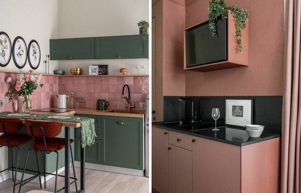 Стены и потолок перекрасили в насыщенный шоколадный оттенок — смелое решение, которое визуально приподнимает потолок и добавляет глубины. На кухне разместили всю необходимую технику для краткосрочного проживания: компактный холодильник, встроенную посудомойку, индукционную плиту на две конфорки и микроволновку, спрятанную за дверцами навесных шкафов.