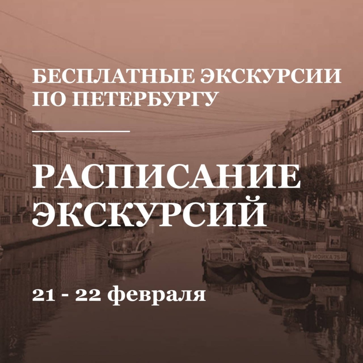: 🚶🏼♂️➡️ПЕШИЕ ЭКСКУРСИИ: Запись — > https://clck.ru/3Rphyf 🔖21 февраля (суббота) ⭐️Бесплатные: 11:00 — 13:00 "Коломенские смотрины. От Пушкина до Блока" 11:30 — 13:00 "По следам вдохновенья: от Юсуповского сада к Никольской церкви" с экскурсией в Николо-Богоявленский Морской собор 12:00 — 13:20 Премьера! "Братство чугунного кольца" 12:15 — 13:45 "Прогулка по Пушкинской улице, как влюбиться в улицу с первого взгляда" 12:30 — 14:15 "По волнам истории: от Волынкиной деревни до Гутуевского острова вдоль реки Екатерингофка" 13:00 — 14:30 "В тени золотого купола" 13:00 — 14:30 "Человеки улицы Бассейной" 14:00 — 15:40 "Дворы Литейного" 14:00 — 16:00 "Ураган по имени Гоголь" 15:00 — 17:00 "Cемимостье — счастливые адреса" 16:00 — 17:15 "По национальности я ленинградец, по отчеству — с Невы" С. Довлатов 💰Платные: 12:00 — 14:00 "Cоветское противоатомное бомбоубежище" 14:00 — 15:30 "Музей-квартира семьи Бенуа (с мини-концертом на арфе)" 15:00 — 16:30 "Военно-исторический музей артиллерии