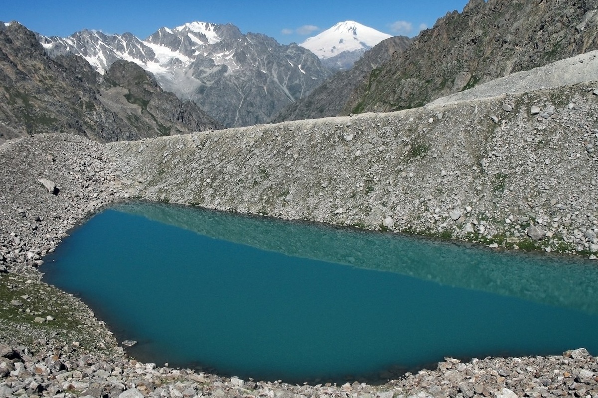 Озеро 3219 м у ледника Юном в долине Куллумколсу, притоке Адырсу. Вдали Эльбрус. Лето 2006 г.
