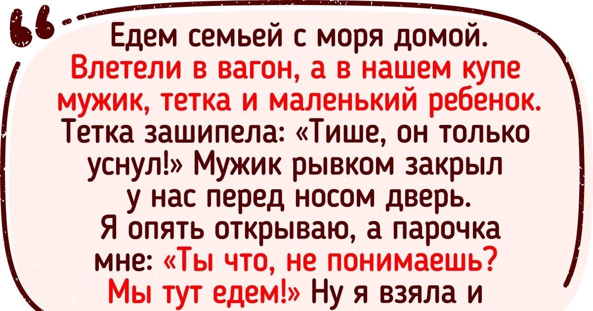 “Едем семьей с моря домой. Влетели в вагон, а в нашем купе мужик, тетка и маленький ребенок. Тетка зашипела: «Тише, он только уснул!» Мужик рывком закрыл у нас перед носом дверь. Я опять открываю, а парочка мне: «Ты что, не понимаешь? Мы тут едем!» Ну я взяла и пошла к проводнице, а она: «Ой, ребят, решайте сами!» Мы опять стучим. Баба на нервах начинает голосить, что мы ей ребенка разбудим. Наконец мужик вышел, и мы выяснили, что это наше купе, а они не знали, что в билете есть номера мест. Думали, кто первый, тот и место выбирает, вот и выбрали наше купе. Мужик такой: «Давайте не будем меняться, мы там уже все салфетками протерли!» Но я настояла, так как у нас 3 места, а у них 2 и лучше поменяться сейчас, чем 3 дня объясняться с новыми пассажирами. С причитаниями они съехали в свое купе. А потом весь вагон на нас смотрел как на врагов, потому что та тетка всем наговорила, что мы с ними плохо поступили.”