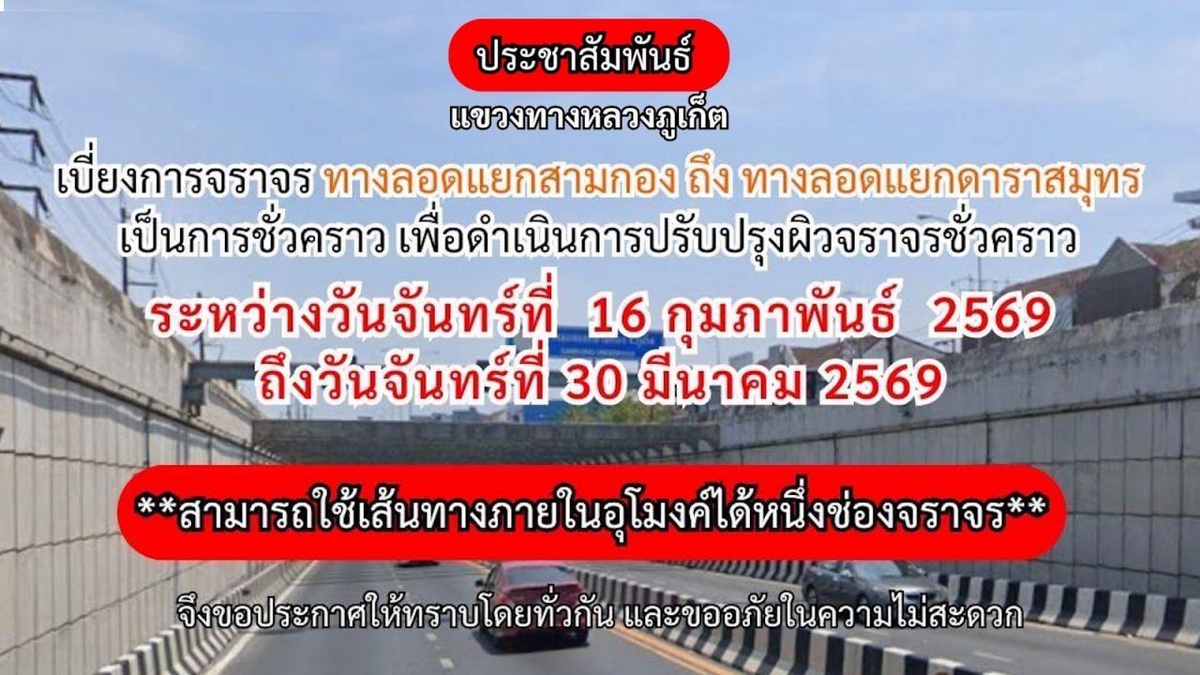 будет ограничено до 30 марта Администрация провинции Пхукет просит водителей с пониманием отнестись к возможным затруднениям движения на шоссе Bypass Rd., вызванным необходимостью обновления дорожного полотна в тоннелях 📍Samkong Underpass (у Lotus's Extra) и 📍Darasamut Underpass (у Central Phuket). Работы стартовали 16 февраля и продлятся до 30 марта. Уведомление о начале дорожных работ в тоннелях было опубликовано 16 февраля на странице Департамента связей с общественностью (PR Phuket). До этого никаких предупреждений не публиковалось. «На протяжении всего срока работ одна полоса в тоннеле будет оставаться доступной для транспорта. Другая полоса в тоннеле не будет затронута работами», – цитирует The Phuket News главу провинциального офиса Департамента скоростных магистралей Виная Кумуанга. The Phuket News уточняет, что 16 февраля синхронно начались работы на полосах Samkong Underpass и Darasamut Underpass, предназначенных для движения в северном направлении. Согласно информации
