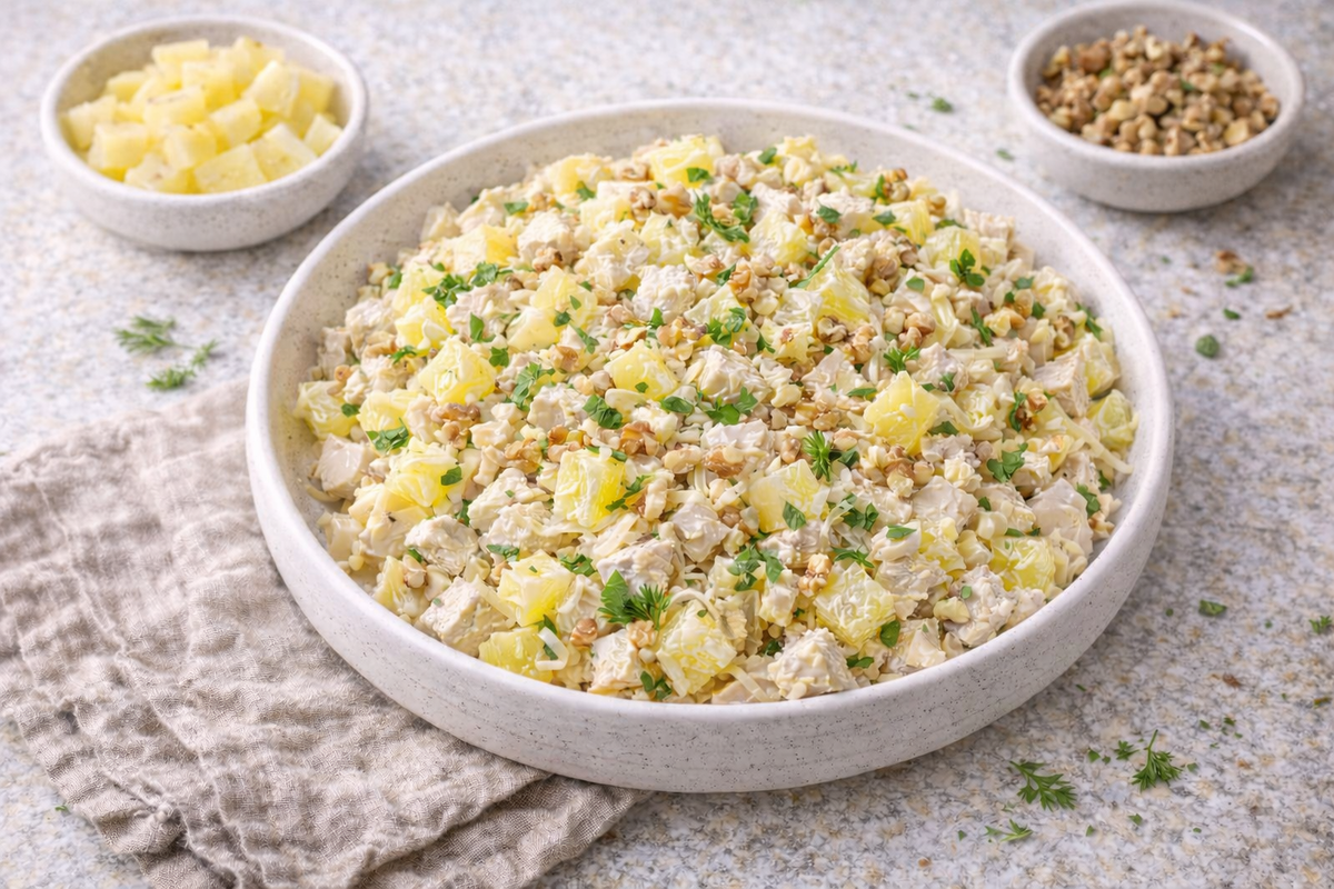 Классическое сочетание нежной курицы, сладкого ананаса и сливочного сыра — идеальный салат для ужина или праздничного фуршета. Ингредиенты: • Куриное филе — 400 г • Ананасы консервированные — 200 г • Сыр полутвердый (сливочный) — 90 г • Чеснок — 1 зубчик • Майонез — по вкусу • Соль — по вкусу • Грецкие орехи — по желанию Готовка: Подаём как самостоятельное блюдо или в тарталетках. Быстро, сочно, вкусно! #курица #ананас #салат #рецептыгастро #сыр #праздник #ужин