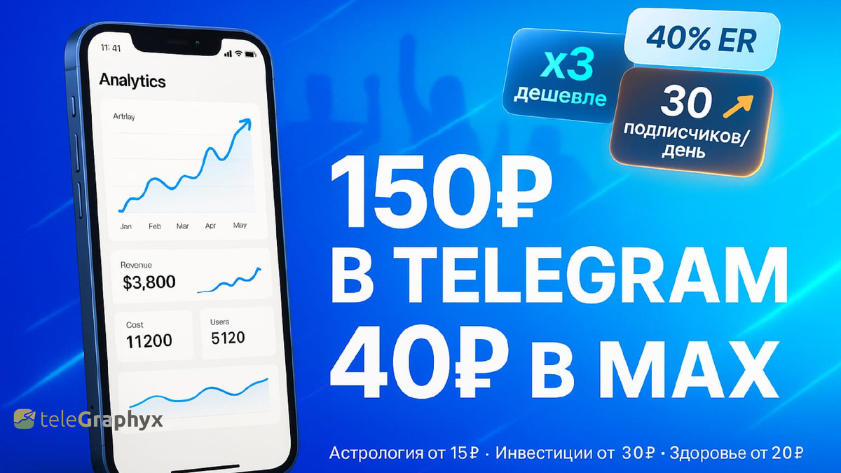 Три года мы платили по 150 рублей за подписчика в Telegram. Привыкли думать: «рынок такой». Конкуренция высокая, цены растут — что поделаешь. А потом зашли в MAX. И всё изменилось. Первый день — 4 подписчика. Думали свернуть эксперимент. Через неделю — 15 в день. Сейчас — стабильные 30 подписчиков ежедневно. И цифры растут без увеличения бюджета. Почему? Яндекс Direct обучается на данных. Чем больше подписок проходит через систему, тем точнее алгоритм находит целевую аудиторию. Стоимость падает сама — с 55₽ в первую неделю до 40-50₽ сейчас. При этом мы работаем в нише «продвижение каналов» — одной из самых дорогих. В менее конкурентных тематиках цены ещё ниже. Средняя стоимость подписчика в MAX: — Астрология — от 15₽ — Инвестиции — 30-50₽ (в Telegram было 300₽!) — Здоровье — от 20₽ — Продвижение каналов — 40-50₽ В Telegram за те же ниши платят 50-150₽ минимум. Разница в 3-4 раза — это реальность перегретого рынка против молодой платформы. Engagement Rate нашего канала в MAX — 40%. Норм