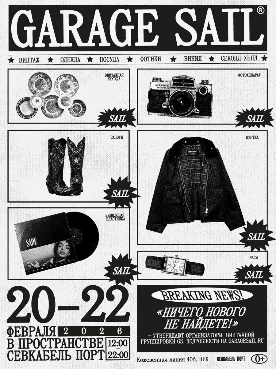 Севкабель открывает новый винтажный сезон! Вас ждет большая гаражная распродажа и шанс найти по-настоящему стильные и ценные вещицы. Ничего нового: только селективный винтаж, актуальный секонд-хенд, посуда, пластинки, аксессуары, фотики, декор и миллион других артефактов. 💰 Вход свободный 🗓️ 20–22 февраля 12:00-22:00 📍 Кожевенная линия, 40Б #локация Вокруг Питера Я в ТГ | Я в MAX | Я в VK