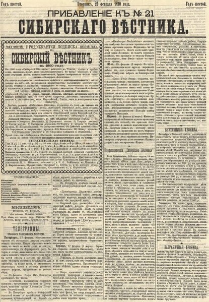 В «Сибирском вестнике» № 21 от 18 февраля 1890 г. сообщается,