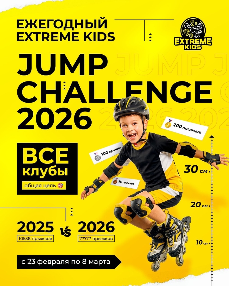 С 23 февраля по 8 марта сеть EXTREME KIDS объединится! Сотни спортсменов, один общий счёт и одна цель на всех: превзойти прошлогодний результат и собрать 10 000+ прыжков в копилку сети. Здесь решает не один герой, а вклад каждого. Даже несколько удачных попыток реально двигают цифру вперёд! 💥 Как это будет? В день челленджа ты прыгаешь через планку. Каждый чистый прыжок без запинки улетает в копилку клуба и прибавляет очки всей сети. Чем больше прыжков – тем ближе новый рекорд. Участвовать может любой ученик EXTREME KIDS с горящими глазами и желанием прыгать на результат. 📍 Дату и время проведения уточняйте у администратора клуба Регистрация уже открыта! Присоединяйся к JUMP CHALLENGE и стань частью нового рекорда