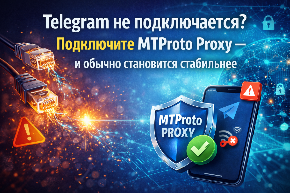 И всё. Чаты не обновляются. Сообщения не уходят. Медиа крутится бесконечно. В этот момент людям не нужен разбор причин. Им нужно, чтобы Telegram снова работал. Самый простой вариант — MTProto proxy Telegram. Это встроенная функция самого Telegram. Ничего устанавливать не надо. Подключение занимает минуту. Подключить прокси в один тап можно через бота: