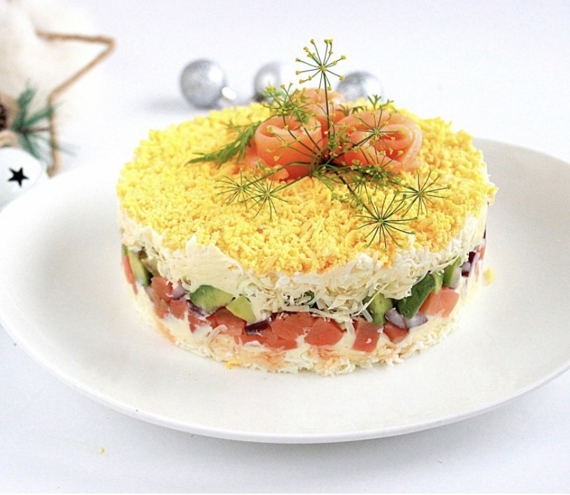 9. Финальный штрих: Верхний слой украшают тонкие лепестки красного лука или мелкие кубики авокадо, также можно украсить несколькими капельками лимонного сока и веточкой укропа.