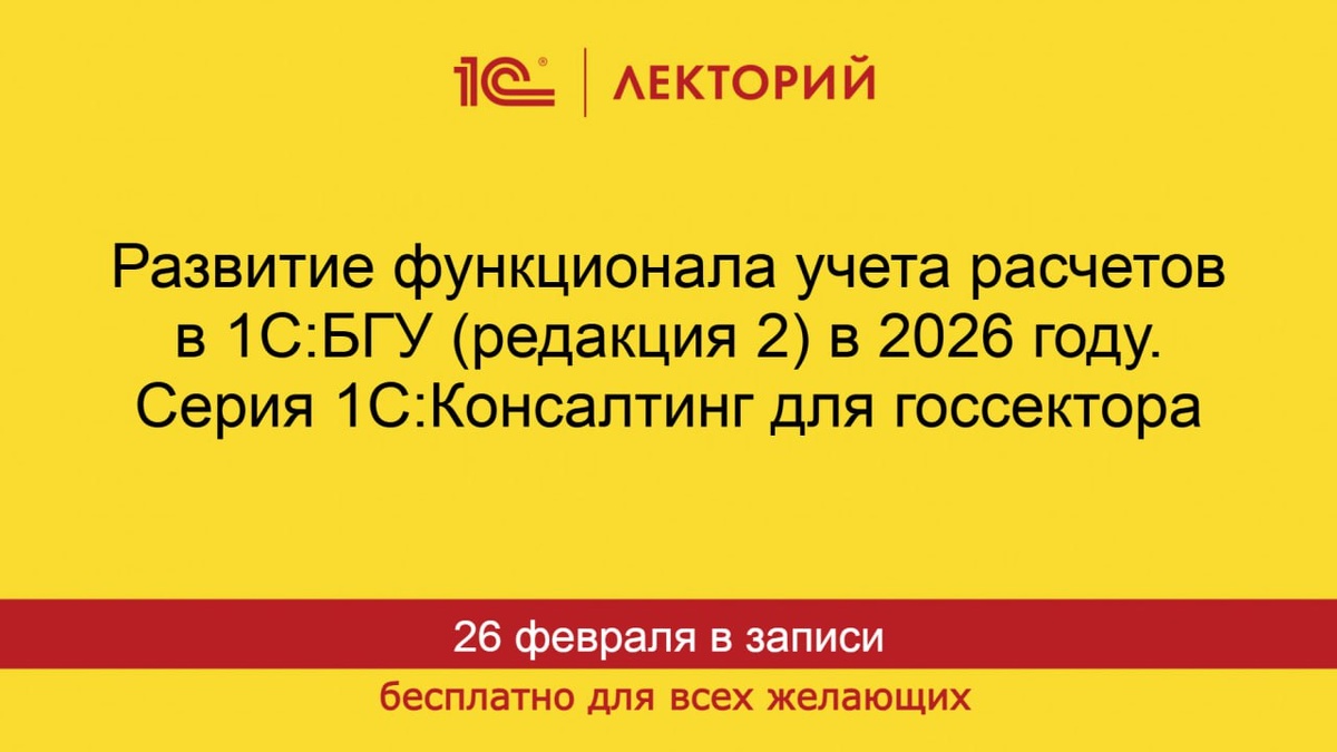 26.02.2026. Развитие функционала учета расчетов в 1С:БГУ (редакция 2) в 2026 году. Серия 1С:Консалтинг для госсектора Лектор: Фадеева Инна Валерьевна, руководитель направления фирмы «1С», ведущий методист по бюджетному учету, автор многочисленных книг по бухгалтерскому учету в государственных учреждениях серии «1С:Бухгалтерский и налоговый консалтинг». Программа лекции: 🟠Нормативное регулирование бухгалтерского учета расчетов в государственном секторе. 🟠Функционал учета расчетов 1С:БГУ (редакция 2). 🟠Ответы на вопросы, заданные при регистрации. В лекции частично использованы материалы семинаров 1С:Консалтинг: "Актуальные вопросы и изменения в учете и отчетности государственных и муниципальных учреждений в 2026 году. Практикум в 1С:Бухгалтерии государственного учреждения" ☝️ Зарегистрироваться на лекцию и задать вопросы лектору 📲 1С:Лекторий в МАХ ❤ 1С:Лекторий в Телеграм