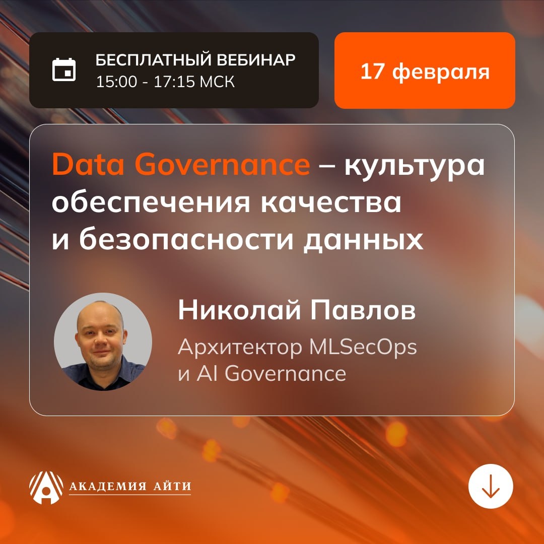 «Data Governance — культура обеспечения качества и безопасности данных». Сегодня ИИ активно используется в рабочих процессах компаний. Но вместе с этим возрастает значение качества данных, прозрачности источников и безопасности моделей. Без выстроенного управления данные становятся зоной риска. На мастер-классе разберём: ✔️Роли и методы обеспечения качества данными в организации ✔️Многоуровневые системы управления данными ✔️Фундаментальные вопросы безопасности ИИ и ML-моделей ✔️Практики и рекомендации по безопасной работе сотрудников с ИИ-системами в разных задачах ✔️AI Governance как новое ИТ-направление: особенности и перспективы Мастер-класс ориентирован на специалистов, работающих с данными, внедряющих ИИ-системы и отвечающих за цифровые процессы. 🗓 17 февраля 2026 🕒 15:00–17:15 (МСК) 💻 Онлайн 🎟 Участие бесплатное Спикер: Николай Павлов, архитектор MLSecOps и AI Governance. Автор уникальных программ и учебных материалов в области безопасности ИИ-систем и Data Governance П