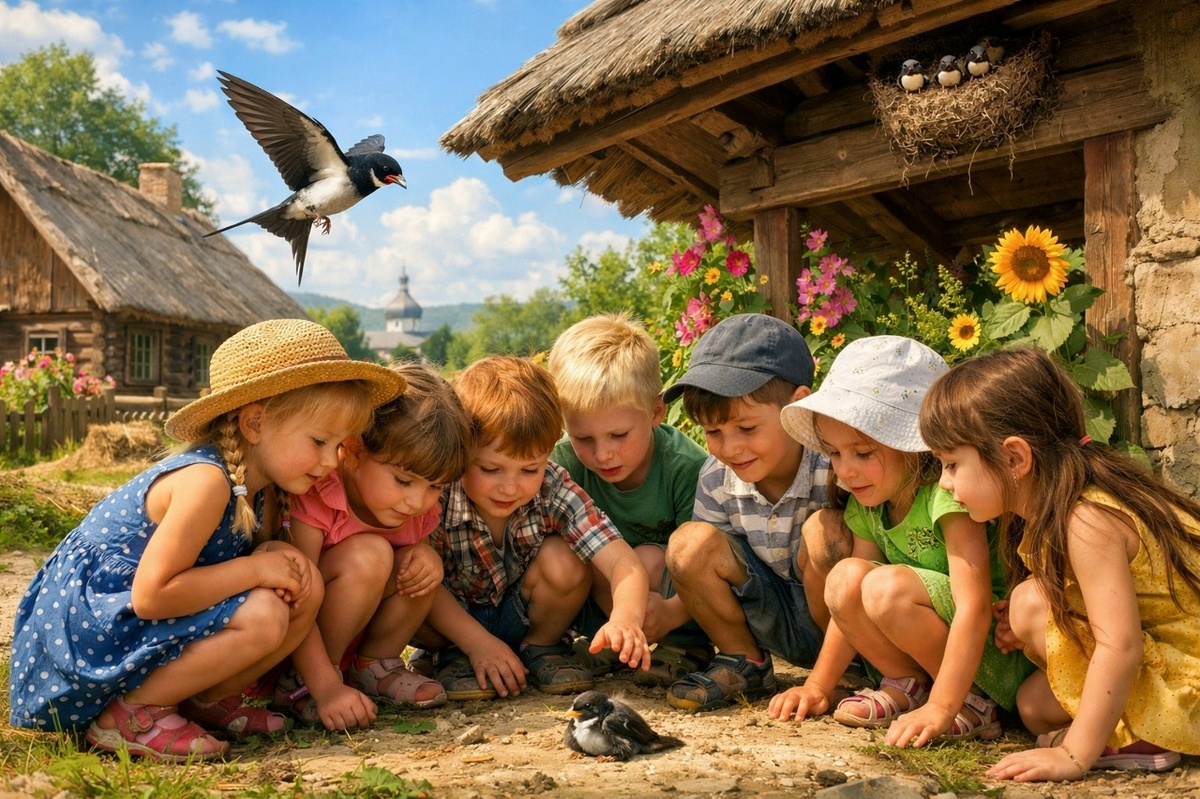 Описание работы: Деревня, дом, под крышей гнездо ласточки, птенец, выпавший из гнезда, ласточка летает над ним, много детей, которые окружили птенца. Работа сделана с помощью нейросети Giga Chat.