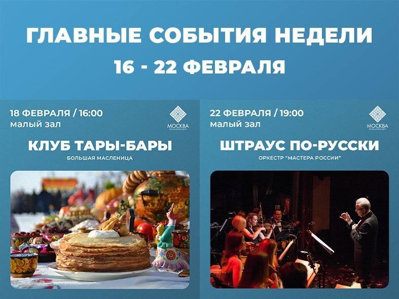 !!! Отмечаем так, как принято в лучших русских традициях: с песнями, хороводами, театром, шутками и весельем! 🌞Клуб «Тары-Бары» приглашает на театрализованное представление «Широкая Масленица» в исполнении артистов Театра художественной публицистики. Наши постоянные партнёры тоже подготовили много мероприятий - культурная программа обещает быть насыщенной. 🗓 Следите за расписанием на нашем сайте, чтобы не пропустить самое интересное. 🎶 Финальным аккордом хлебосольной недели станет новая концертная программа оркестра популярной музыки «Мастера России» «Штраус по-русски» / «Не только Штраус». ✨Изящная музыка, знакомые мелодии в неожиданном прочтении - прекрасный повод завершить неделю красиво. Билеты и подробности https://moscowfc.ru/playbill/