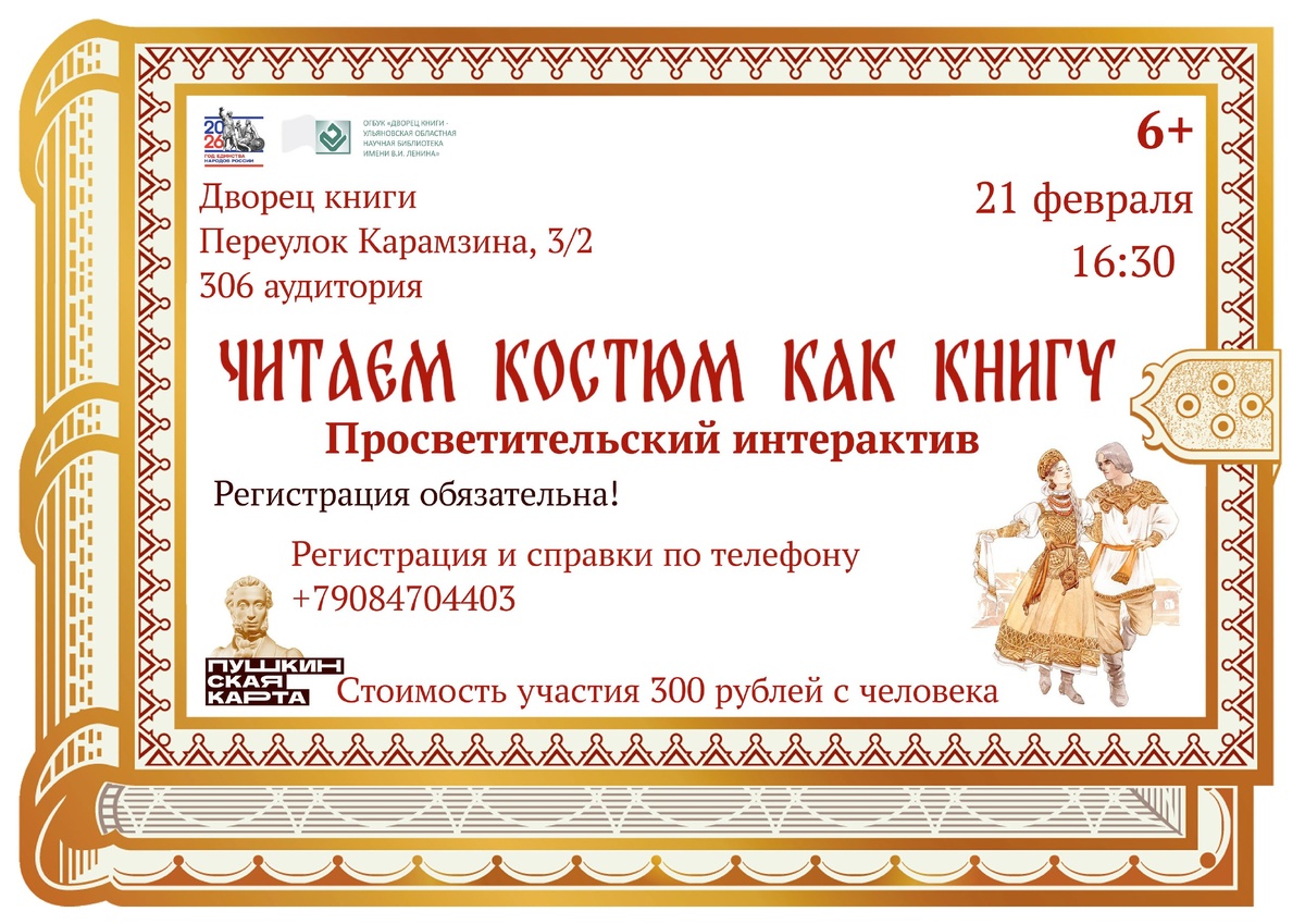 ! 📆 21 февраля в 16.30 состоится просветительский интерактив «Читаем костюм как книгу» (6+) ✅ Желающие познакомятся с историей русского национального костюма, узнают, какие предметы носили женщины и мужчины, что означает орнамент, от чего оберегали пояс и головной убор ✅ Подробнее узнают о женском костюме Симбирской губернии: чем он отличался от нарядов других русских красавиц, из каких материалов его создавали, как носили 📚 Яркими иллюстрациями станет литература из фонда Дворца книги и коллекция кукол в русских народных костюмах 📍 Стоимость участия 300 рублей с человека (действует Пушкинская карта). Билеты ❗️Обязательна предварительная регистрация по телефону: +79084704403 Напомним, что 2026 год объявлен президентом РФ Годом единства народов России Подробнее о мероприятии - на сайте #ДворецКниги_афиша