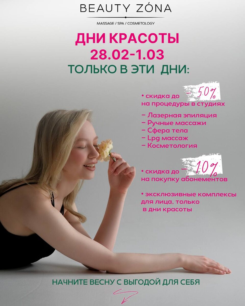 ВЕСЕННИЕ ДНИ КРАСОТЫ В BEAUTY ZONA 🥳 Только 2 дня – 28 февраля и 1 марта, во всех студиях Beauty Zona скидки до -50% на процедуры: ▫️-50% на аппаратные методики по телу ▫️-50% на ручные массажи ▫️до -45% эксклюзивные косметологические комплексы для лица • Ручной массаж тела классический (75 )- 1145₽ вместо 2290₽ •Эндосфера тела - 945₽ вместо 1890₽ •LPG массаж тела - 795₽ вместо 1590₽ Записывайтесь на удобное для вас время, прямо сейчас 📲 💌 @Beauty_zona_54 📞+7 (968) 174-32-28 Ⓜ️ Студенческая, Выставочная, 38/1 Ⓜ️ Гарина-Михайловского, пр.Комсомольский, 24 Ⓜ️ Маршала Покрышкина, Гоголя 38