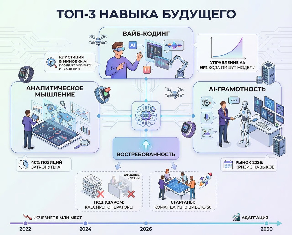 Вайб-кодинг входит в топ-3 навыков будущего. Вместе с аналитическим мышлением и AI-грамотностью. К 2030 году исчезнет 5 миллионов рабочих мест. 40% всех позиций уже затронуты AI. 39% ваших текущих навыков устареют за 4 года. Кто под ударом? Много разных профессий. Офисные менеджеры. Операторы кол-центров. Кассиры. Банковские работники. Копирайтеры, дизайнеры, программисты. Не исчезнут за день. Но превратятся в полставки без роста зарплат. Что спасает? Умение управлять AI. Стартапы уже делают руками 10 человек то на что раньше нужна команда из 50. Люди ставят задачи, проверяют результат, доводят до продукта. Это и есть вайб-кодинг. Не замена людей. Замена навыков. Кто научится - останется востребованным. Кто будет ждать пока "устаканится" - окажется в списке устаревших профессий рядом с кассирами и клерками. Рынок 2026 - это не кризис вакансий. Это кризис навыков. Какие у вас есть? Подписывайтесь на мой канал в Max