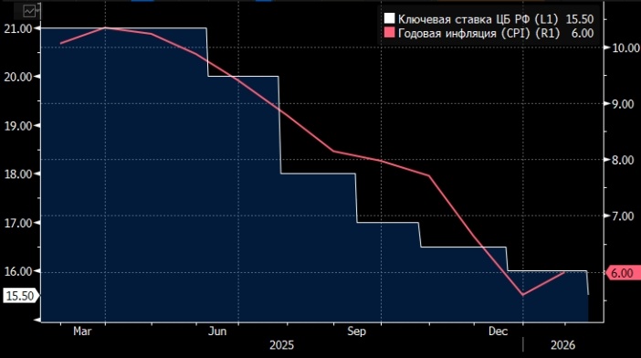 Снижение ставки ЦБ РФ в марте 2026г может составить 50 б.п. - ПСБ Снижение ключевой ставки Банка России по итогам заседания в марте текущего года может составить 50 базисных пунктов (до 15% годовых), ее прогноз на конец 2026 года пока сохраняется на уровне 12% годовых, говорится в материале аналитика банка ПСБ Дениса Попова. "Вопреки консенсус-прогнозам, но в соответствии с нашими ожиданиями, Банк России в феврале снизил ключевую ставку на 50 базисных пунктов (б.п.), до 15,5% годовых. При этом регулятор предвосхитил наши прогнозы и смягчил сигнал", - отмечает эксперт. Одновременно ЦБ скорректировал прогноз инфляции на 2026 год вверх - до 4,5-5,5% с 4-5%, приблизив его к консенсус-прогнозу рынка (5,3%). Кроме того, регулятор сузил прогноз среднегодовой ключевой ставки на 2026 год до 13,5-14,5% с 13-15% . На 2027 год прогноз средней ставки повышен до 8-9% с 7,5-8,5%. Все указывает на то, что цикл нормализации денежно-кредитной политики (отход от "жесткой" политики) будет более продолжите