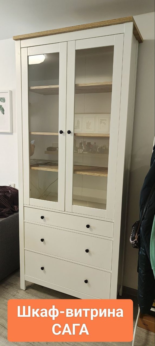 😊 ⚡️ Сегодня хорошо потрудились и собрали у заказчиков и витрину Сага и тумбу под ТВ Кымор. А зал пополнили симпатичным стеллажом Скандинавия и тумбой из массива Кантри 02😊 ✏️Друзья, напоминаем, что вы можете проверить остаток бонусных баллов через нашего телеграм бота по ссылке @IdeanadomIKEA_bot