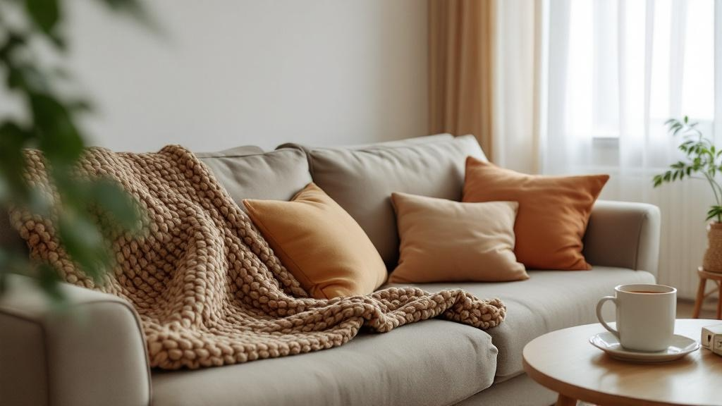 При выборе пледа обращайте внимание на размер - он должен быть достаточно большим, чтобы свисать с дивана или кресла. Маленький плед не даст нужного эффекта. Цвет лучше выбирать в тёплой гамме - бежевый, горчичный, терракотовый, серо-коричневый. А крупная вязка всегда выглядит уютнее гладкой ткани.