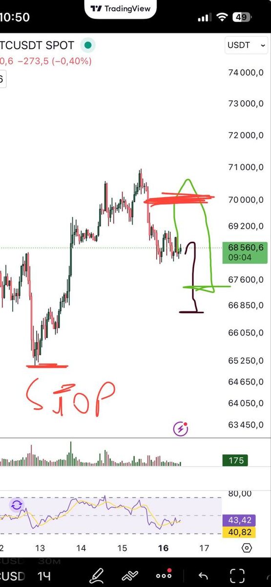 BTC здесь нужно наблюдать как цена будет вести себя , по зеленому или черному