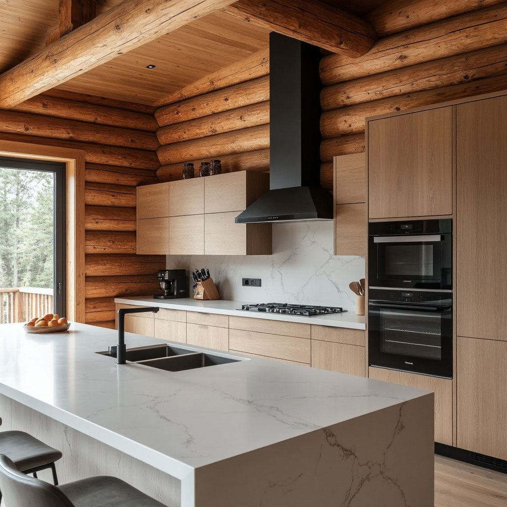 Деревянный дом пахнет смолой, дышит историей и создает ощущение надежного тыла. Но когда дело доходит до ремонта кухни, эта идиллия часто разбивается о суровую реальность: стены «гуляют» при усадке, бревна создают сложный рельеф, а пар от кастрюль — главный враг натуральной древесины.
