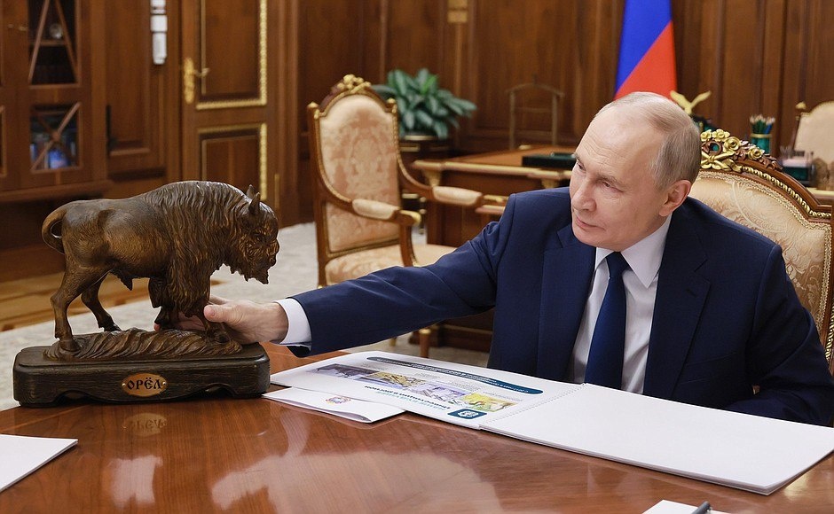 Фотофакт: Андрей Клычков в ходе встречи с Владимиром Путиным подарил президенту деревянную статуэтку зубра