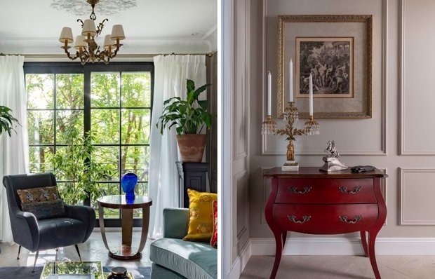 Вся квартира построена на концепции «шкатулки»: камерное, театральное пространство, где антикварные предметы не случайный декор, а вещи с историей, формирующие настроение. Кресло, журнальный столик, комод, ковер с рисунком — каждый предмет подбирался из личной коллекции владельца. Подход принципиально отличается от покупки антикварного стиля в мебельном магазине: подлинные вещи создают атмосферу, которую невозможно сымитировать. Антикварных предметов оказалось так много, что пришлось устроить что-то вроде гаражной распродажи, чтобы найти им новых владельцев и оставить только самое значимое.