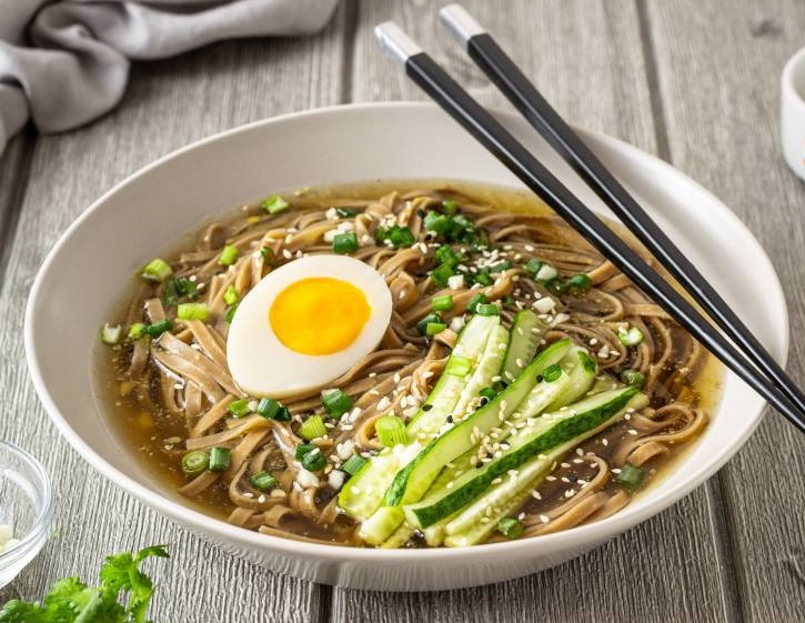 Добрый день, уважаемые читатели! Вы на канале "Подбери Слюни" Нэнмён - это корейский суп который едят холодным. Зачастую после полноценной трапезы, люди ощущают тяжесть в животе, так вот корейцы употребляют этот суп когда уже сыты. Он имеет чудодейственное свойство облегчать тяжесть в животе, поэтому и едят его после переедания)) Итак, поехали! Для рецепта нам понадобится: Лапша гречневая 100 грамм Огурец 1 штука Яйцо 1 штука (вареное) Лук зеленый 10 грамм Чеснок 1 зубчик Кунжут 1 ст. ложка Вода 700 мл Грибы сушеные 50 грамм (шиитаке) Водоросли 20 грамм (вакамэ, комбу) Соевый соус По вкусу Кубик бульонный 1/2 штуки (говяжий) Соль По вкусу В кипящей воде растворите бульонный кубик. Добавьте водоросли и сушеные грибы. Проварите 20-30 минут. В конце посолите по вкусу. Процедите бульон, добавьте кубика льда, чтобы его остудить. Он должен стать холодным. Влейте соевый соус в бульон. Огурец нарежьте брусочками, подсолите. Чеснок и зеленый лук мелко порубите. Отварите гречневую лапшу и промой