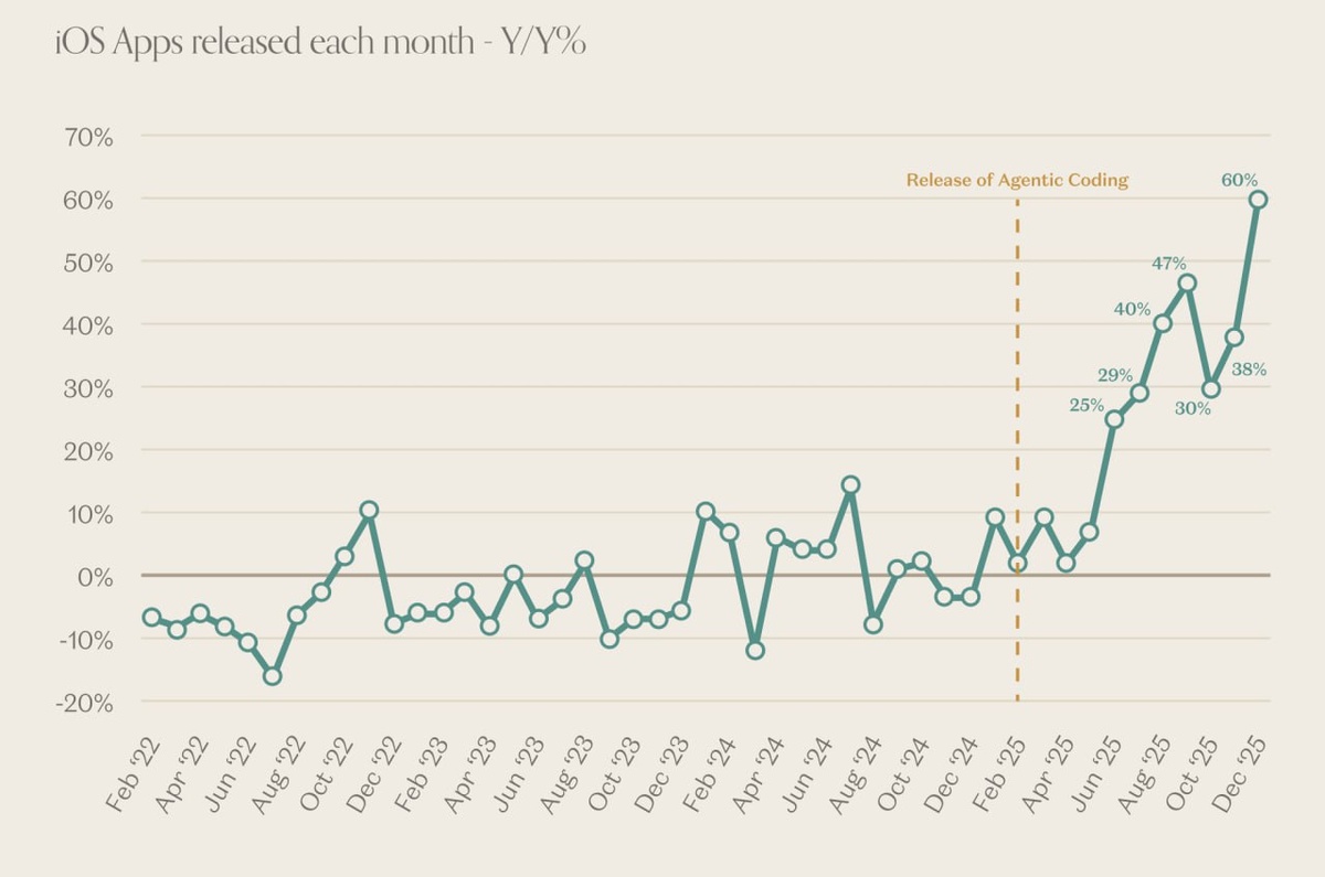 В декабре количество новых релизов iOS-приложений увеличилось на 60% по сравнению с прошлым годом. Снижение порога входа в разработку позволило соло-разработчикам собирать MVP за несколько дней, тогда как ранее на это требовались месяцы у мини-студий. https://dzen.ru/id/5c0e38ff46ef5c00aaa80527