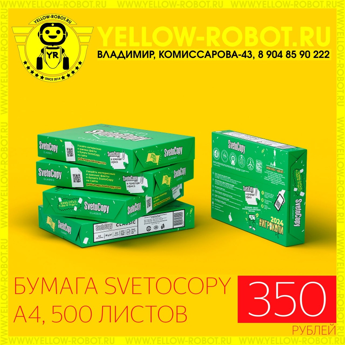 ! Представьте: утро, офис гудит, как улей, дедлайны дышат в спину, а ваш принтер жадно ждёт «пищи». Что спасает ситуацию? Конечно же, стопка надёжной бумаги SvetoCopy! 💾 📃 Почему бумага SvetoCopy — это must have для офисного супергероя? ✅ Не капризничает. Принтер полюбит её с первого листа! Забудьте о зажёванных страницах и нервных срывах у офисного оборудования. ✅ Идеальная печать. Четкие буквы, яркие цвета — ваши отчёты будут выглядеть так, будто их создал профессиональный дизайнер. ✅ 500 листов в пачке — это как запас энергии у супермена! Хватит на кучу важных документов, презентаций и даже на пару творческих набросков. ✅ Цена — просто огонь! Всего 350 рублей за пачку А4. Экономьте деньги, но не на качестве! 🏢 Где раздобыть этот офисный эликсир? Конечно у нас - Владимир, ул. Комиссарова, 43.