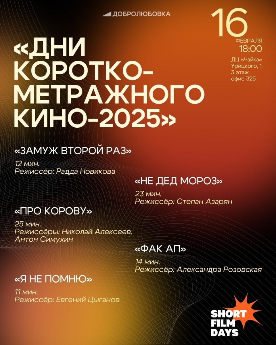 📽 Зрителей ждут пять новых игровых короткометражек, снятых в 2025 году. 📆16 февраля в 18:00 | 📍Архангельск, ул. Урицкого, 1 (этаж 3, кабинет 325) 🎫 Вход свободный 😊 Подписаться на «Радар Поморья» | Мы в MAX
