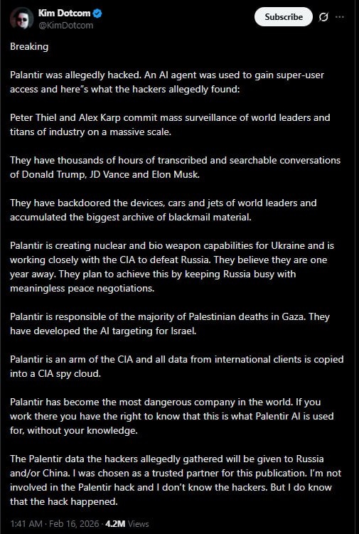 о «взломе» Palantir и новом вбросе Кима Доткома 🔸Сегодня в сети появилось довольно забавное заявление популярного IT-предпринимателя Кима Доткома о якобы взломе компании Palantir. Мол, получен «суперпользовательский доступ», вскрыта глобальная система слежки, найдены архивы разговоров Трампа, Маска и прочих, а заодно — разработки ядерного и биологического оружия для т.н. Украины. 🔸Проблема в том, что кроме одного-единственного треда самого Доткома — ничего нет. Ни дампов, ни скриншотов интерфейсов, ни технических артефактов, ни подтверждений от профильных киберкомпаний. Для истории масштаба «самая опасная компания мира вскрыта» — тишина подозрительно оглушительная. 🔸Репутация источника тоже имеет значение. Ким Дотком давно прославился громкими политическими и финансовыми пророчествами — от «скорого коллапса доллара» до сенсационных разоблачений, которые растворялись без следа. Поэтому и сейчас относиться к его словам нужно с максимальным скептицизмом. 🔸Это не означает, что Palantir