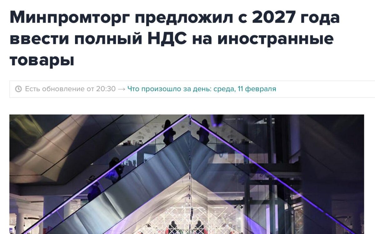 История разворачивается быстро. Минпромторг официально выступил с инициативой: с 2027 года обложить 22% НДС зарубежные товары, которые продаются через маркетплейсы. Это не кулуарные разговоры. Это предложение на уровне ведомства. И речь идет не о косметических правках, а о полноценной ставке 22%. Параллельно Минфин еще в октябре 2025 года предлагал более мягкий сценарий. Не сразу 22%, а постепенное повышение в течение пяти лет: 5%, 10%, 15%, 20%. Растянуть процесс до 2030 года. Сейчас спор не о том, будет ли рост. Спор о скорости принятия решения. 🔵 Если примут 22% сразу: что произойдет Первое - розничные цены на импорт. Цена импортной футболки, чехла или запчасти вырастет на 22% моментально. Продавцы не будут оплачивать налог из своей маржи. Они просто переложат его в цену. Альтернативы здесь нет. Выбор «купить здесь или заказать там» перестанет быть ценовым. «Там» станет так же дорого, как «здесь». 🔵 Второе - комплектующие и сырье Импортный НДС - это не только история про к