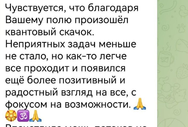 ? 💫 Мои хорошие, мы говорим про деньги, но когда вы убираете блоки и меняете установки — меняется не только доход! Меняется вся ваша жизнь 🙏 Сегодня расскажу, что ещё вы получите на марафоне: 1. Уверенность в себе Когда вы убираете установки вместо них появляется уверенность. Вы начинаете чувствовать: всё возможно! 💪 Вы можете попросить повышение, можете назвать свою цену, можете начать своё дело. Можете заявить о себе. То, что раньше казалось страшным — становится естественным ✨ 2. Прилив сил и энергии Энергия, которая была заперта в зажимах и блоках, освобождается! 🔥 И вы чувствуете: • прилив сил • желание действовать • лёгкость в теле • ясность в голове Вы больше не живёте в режиме "выживания” и истощения. Вы наполнены! 💫 3. Новые идеи Когда вы в ресурсе, наполнены энергией и уверенностью — к вам буквально льются новые идеи! 💡 Идеи, которые можно реализовать. Которые принесут деньги. Вы вдруг понимаете: • “А ведь я могу предложить ещё эту услугу!” • “Я могу обучиться это