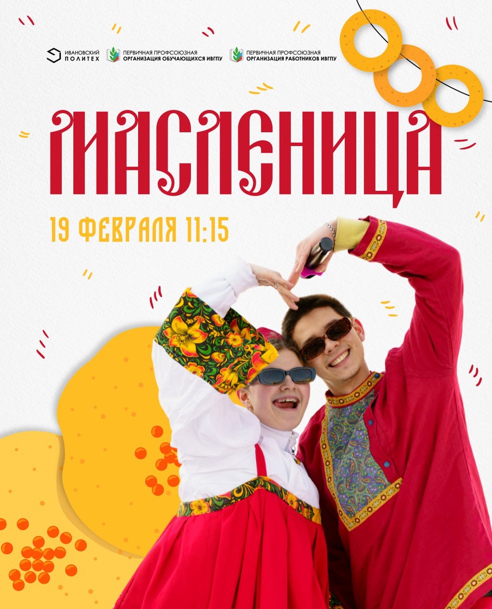! Понедельник – ВСТРЕЧА 🍳В этот день начинаем печь первые блины. Неделя делится на две части. У каждой из них свое название: с понедельника по среду – Узкая Масленица, с четверга по воскресенье – Широкая. 😎 Как раз в четверг и будем отмечать Широкую Масленицу В программе: 🔸 11:15 -12:00 Масленичные забавы: игры, конкурсы и хороводы. 📍Площадка перед главным корпусом ИВГПУ 🔸12:00 - 12:45 Конкурс «Самый красивый и вкусный масленичный стол» Вас будут ждать горячий чай и вкусные блины 📍Фойе перед Актовым залом Отметим Широкую Масленицу на широкую ногу! 👻 ИВГПУ в MAX | 📲 ИВГПУ в ВК 👻 Приемная комиссия ИВГПУ