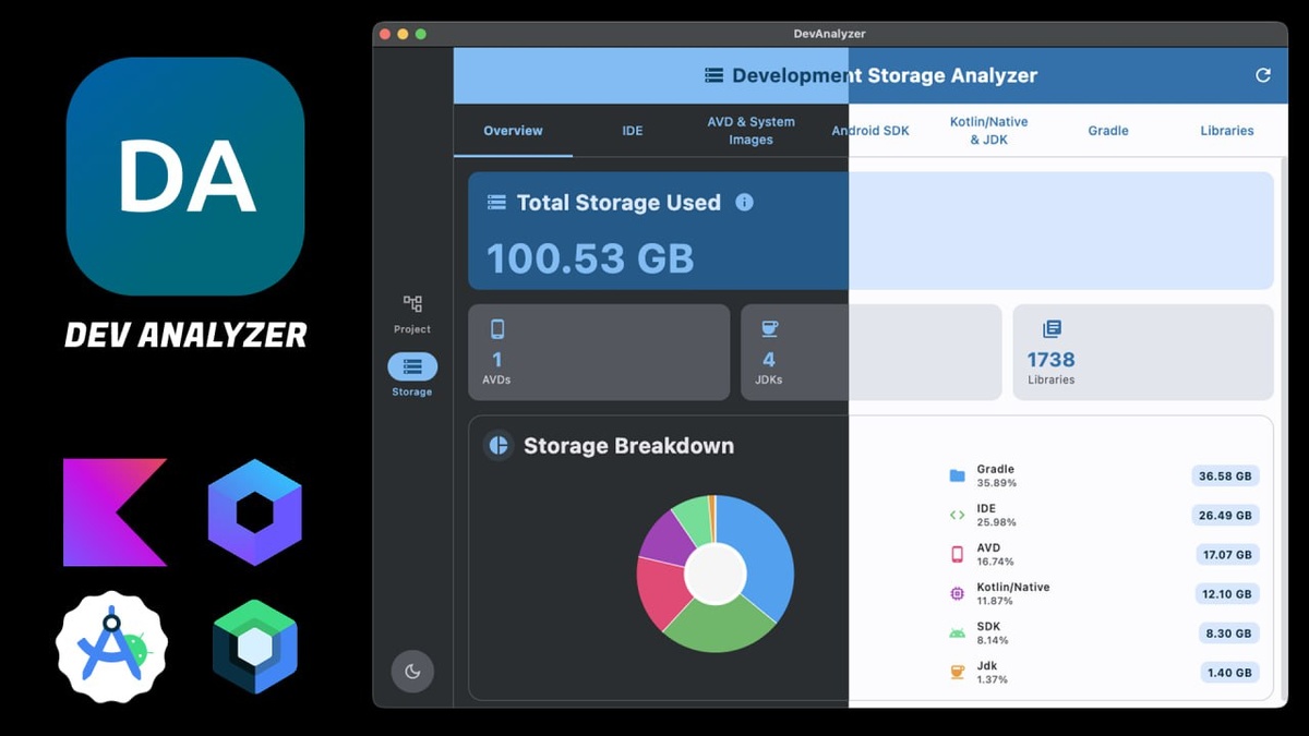 DevAnalyzer — это кроссплатформенное настольное приложение, созданное с использованием Compose Multiplatform и Kotlin Multiplatform (KMP). • Анализатор проектов — анализирует модули проекта, конфигурации Gradle, примененные плагины, зависимости и связанные файлы сборки. • Очистка сборки — сканирует проекты Android Studio на наличие папок сборки во всех модулях и позволяет выборочно удалять их для освобождения дискового пространства. • Анализатор хранилища — сканирует SDK, данные IDE, кэши Gradle и каталоги библиотек для визуализации общего использования хранилища. • Настройки — настраивает пользовательские пути для Android SDK, домашнего каталога Gradle, Kotlin Native и расположения IDE. Разработанный для современных разработчиков, DevAnalyzer помогает вам понимать, анализировать и оптимизировать всю вашу экосистему разработки — все из единого интерфейса. Разработанный как инструмент, ориентированный в первую очередь на настольные компьютеры, он бесперебойно работает на разных платф