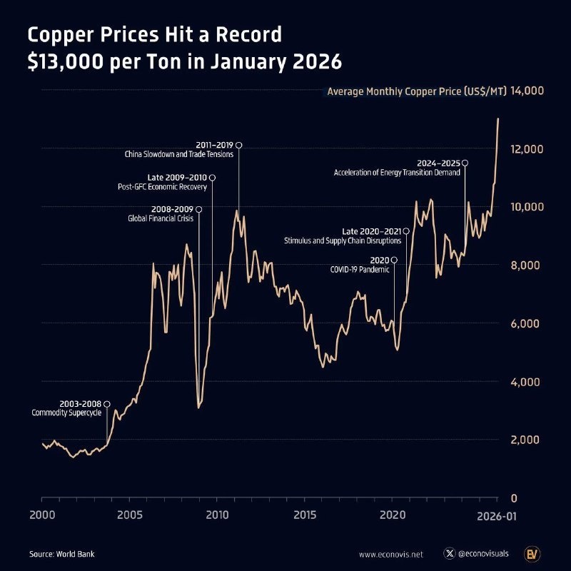 Средние ежемесячные цены на медь в январе 2026 года достигли исторического максимума — 13 012 долларов за метрическую тонну (5,90 доллара