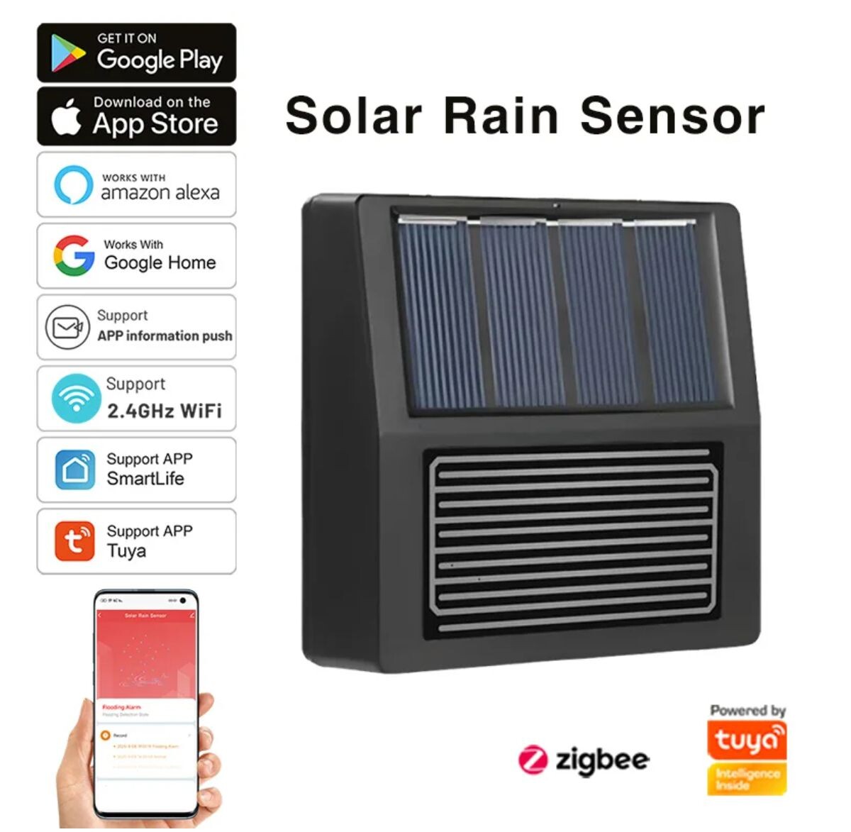 Датчик дождя.с солнечной батареей датчик Rainfall Tuya Zigbee. Есть такое же исполнение с wi-fi. Отправляет мгновенные уведомления на смартфон через приложение Tuya Smart при обнаружении дождя. Количественных данных нет. По экранам приложения очень похож на датчик протечки. Можно сделать автоматизацию совместно с умными окнами, дверями или навесами, чтобы закрыть их автоматически при обнаружении дождя. Технические характеристики Источник питания Солнечная батарея с литиевой аккумуляторной батареей уровень защиты IP65 Метод связи Zigbee (IEEE 802.15.4) Рабочая температура-20°С до +70°С Диапазон влажности от 0% до 95% относительной влажности (без конденсации) Размеры: 8X8X2,5 см Вес: 80 г Габариты. Заявлено, что корус ip65 Но верится в это с трудом. Зазоры в местах крепления винтами не герметичны.