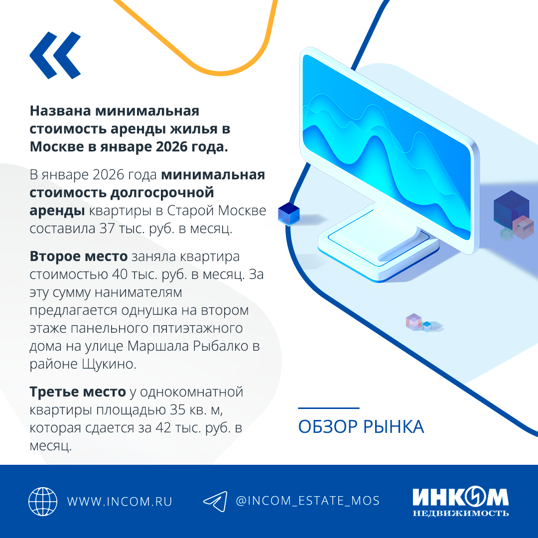 В январе 2026 года минимальная стоимость долгосрочной аренды квартиры в Старой Москве (без учета Зеленграда) составила 37 тыс. руб. в месяц. Об этом в поступившем в редакцию исследовании сообщили аналитики риелторской компании «Инком-Недвижимость». Самый доступный вариант для аренды расположен на последнем этаже пятиэтажки в Булатниковском проезде в районе Бирюлево Западное. Это однокомнатная квартира площадью 35 кв. м, отметили риелторы. Второе место заняла квартира стоимостью 40 тыс. руб. в месяц. За эту сумму нанимателям предлагается однушка на втором этаже панельного пятиэтажного дома на улице Маршала Рыбалко в районе Щукино. Площадь объекта составляет 17 «квадратов», говорится в исследовании. Третье место у однокомнатной квартиры площадью 35 кв. м, которая сдается за 42 тыс. руб. в месяц, уточнили в «Инком-Недвижимости». Она расположена на восьмом этаже панельной 12-этажки на Бирюлевской улице в районе Бирюлево Восточное. Четвертую позицию занимает вариант за 43 тыс. руб. в месяц.