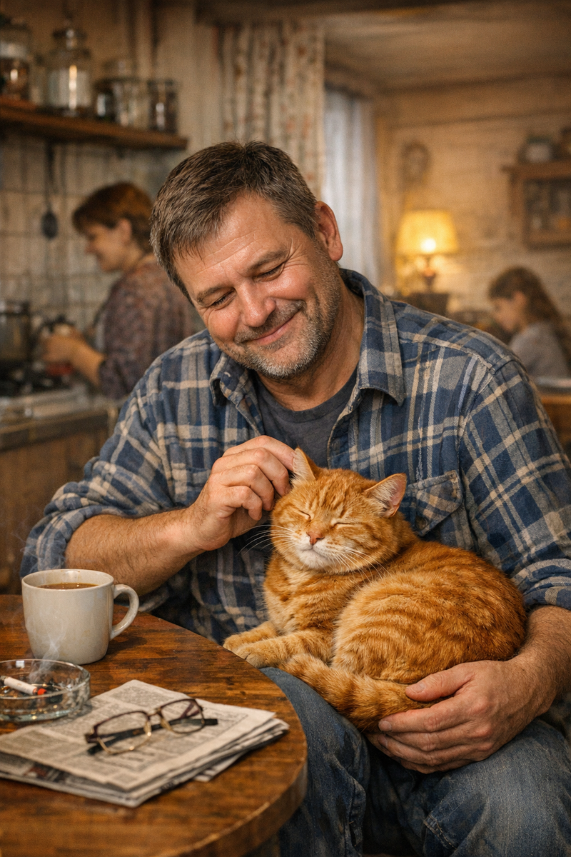 Однажды вечером Василий сидел на кухне. Рыжик запрыгнул к нему на колени, свернулся клубком, замурлыкал. Василий погладил его по тёплой, мягкой спине. Кот подставил голову, зажмурился от удовольствия.