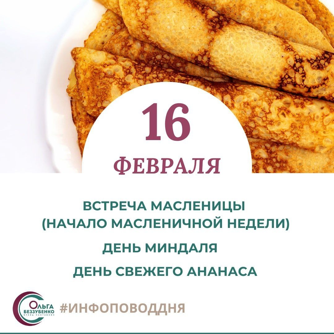Сегодня - Встреча Масленицы (Начало масленичной недели), День миндаля, День свежего ананаса О чем рассказать: 💚Масленица — это наш культурный код. Важно призывать не отказываться от блинов, а практиковать осознанное потребление. Дать рекомендации по допустимой порции. Рассказать, какие начинки для блинов менее калорийны, содержат меньше соли и сахара 💚Не только о пользе миндаля, но и о рисках– аллергия, калорийность 💚Ананас сжигает жиры – правда или миф? Кислота ананаса и зубная эмаль. Противопоказания