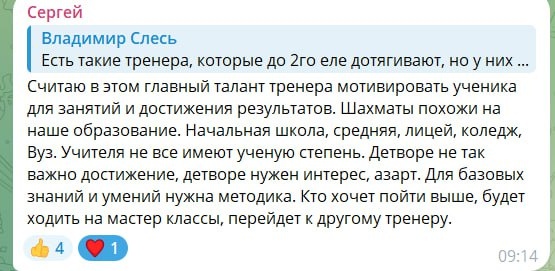 Любой взрослый умеет читать и считать, а значит, он может любого ребенка научить читать книги и таблице умножения. Тоже самое и с любителями шахмат. Любителям не нужно ставить цель сделать учеников чемпионами мира. Достаточно передать базовые знания. P.S. Напомню, что сегодня в 13.00 по мск у нас созвон с Людмилой Быковой. Людмила расскажет о своем пути из любителя в тренера: - что помогло ей побороть сомнения и страхи. - как она нашла первых учеников - как заниматься с детьми, чтобы они выигрывали турниры.