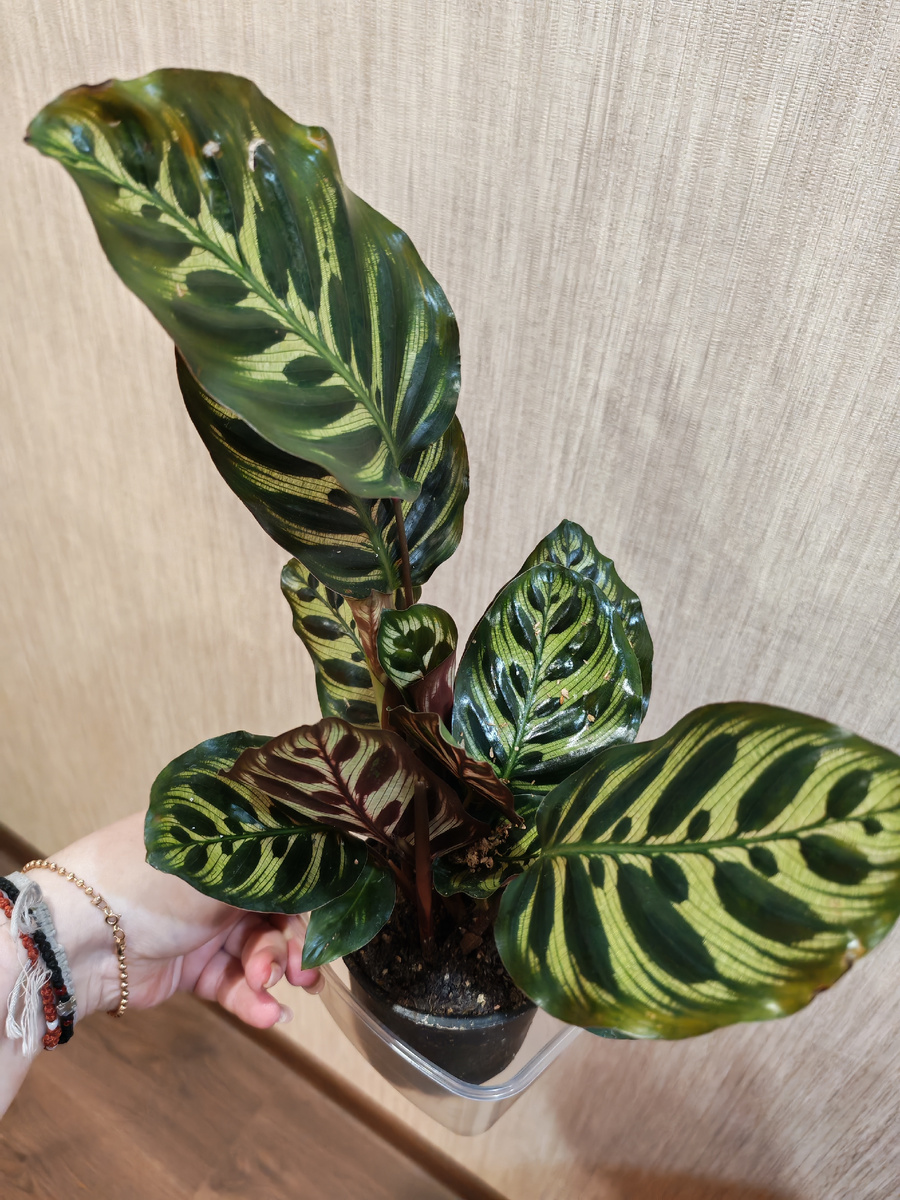 Всем привет👋 Настало время пересадить мою новенькую калатею Макояна, которая у меня появилась совсем незапланированно. Просто утром заехала за кофе, а в итоге купила калатею. Не удержаласЯ я! Дома калатея больше недели простояла отдельно от остальных растений. Так поступаю всегда с новыми цветочками, чтобы в первую очередь обезопасить все свои растения и не занести каких-нибудь ненужных паразитов. Карантин, так сказать. На карантине побыли, пора пересаживаться и занимать свое место на балконе. Первым делом помыла все листики от каких-то зерен. Наверное во время транспортировки на растения просыпали их, а вот убрать не посчитали нужным. Листья отмыла и взялась за корни. Тут все интереснее. Корешки оказались очень хорошие. Я даже и не думала, что у калатеи такие картохи на корешках образуются. На некоторых корнях имеется чернота, которая явно свидетельствует о том, что начались плохие процессы на корешках. Я принялась убирать магазинный грунт с корней. Задача не самая простая, так как