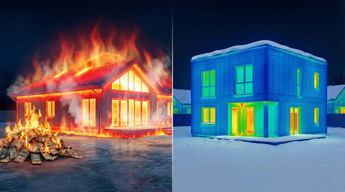 Физика процесса проста: чем выше площадь теплового контура при неизменном объеме, тем выше трансмиссионные теплопотери. Идеальной формой с точки зрения минимизации оболочки является куб. Одноэтажный дом большой площади неизбежно превращается в «плоский параллелепипед». Площадь его теплообмена с внешней средой в среднем на 35–45% выше, чем у двухэтажного дома аналогичной жилой площади.