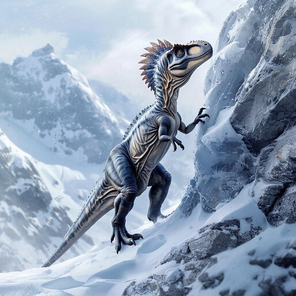 Прошли сезоны. Норд уже не падал. Он шел по ледяной стене, как тень. Он находил невидимые другим трещины, цеплялся за крошечные выступы, а его дыхание, согревавшее лёд перед ним, на мгновение создавало плёнку воды, которая тут же замерзала и давала лучшее сцепление. Он достиг вершины Глотки Холода и увидел мир, который не видел ни один динозавр его стаи: бескрайние снежные поля, дымящиеся вулканы на горизонте и стаи перелётных птиц под самыми облаками. В его груди зазвучала песня свободы и восторга.