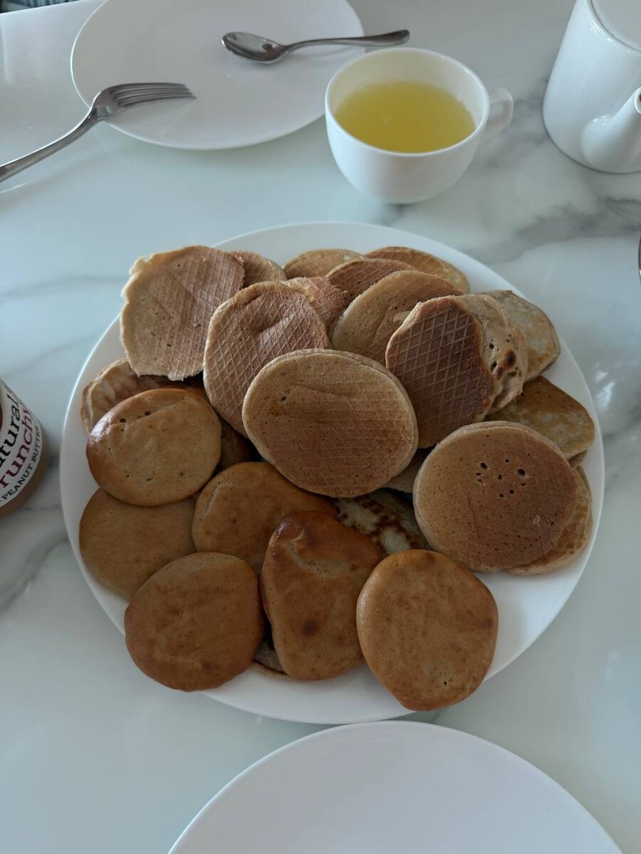 ! На завтрак насуетили протеиновые панкейки и бисквиты. За кадром клиновый сироп и ягоды. 🍓 Умчали вытворять дела! Ну и рецепт, если вдруг захочется ППшных блинчиков с высоким содержанием белка 😛 Ингредиенты (на 1 порцию): • протеиновый порошок (ванильный или нейтральный): 30 г (1 мерная ложка); • яйца куриные: 1–2 шт. (или 1 целое + 2 белка для большего белка); • овсяные хлопья быстрого приготовления или мука (миндальная, кокосовая, цельнозерновая): 20–30 г; • разрыхлитель теста: ½ ч. л.; • вода: 50–70 мл для консистенции густой сметаны; • щепотка соли и/или ванилин по вкусу. Приготовление: Все сухие ингредиенты (протеин, овсянку, разрыхлитель) смешать в миске. Добавить яйца и воду, тщательно взбить венчиком (мне удобнее вилкой) до получения однородного теста без комков. Дать тесту постоять 5 минут, чтобы овсянка набухла, и панкейки будут в итоге пышнее. Разогреть антипригарную сковороду на среднем огне, смазать её минимальным количеством масла (можно использовать спрей). Вы